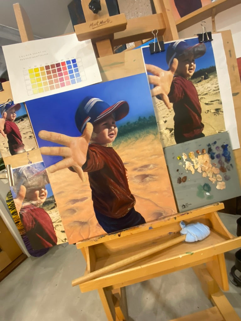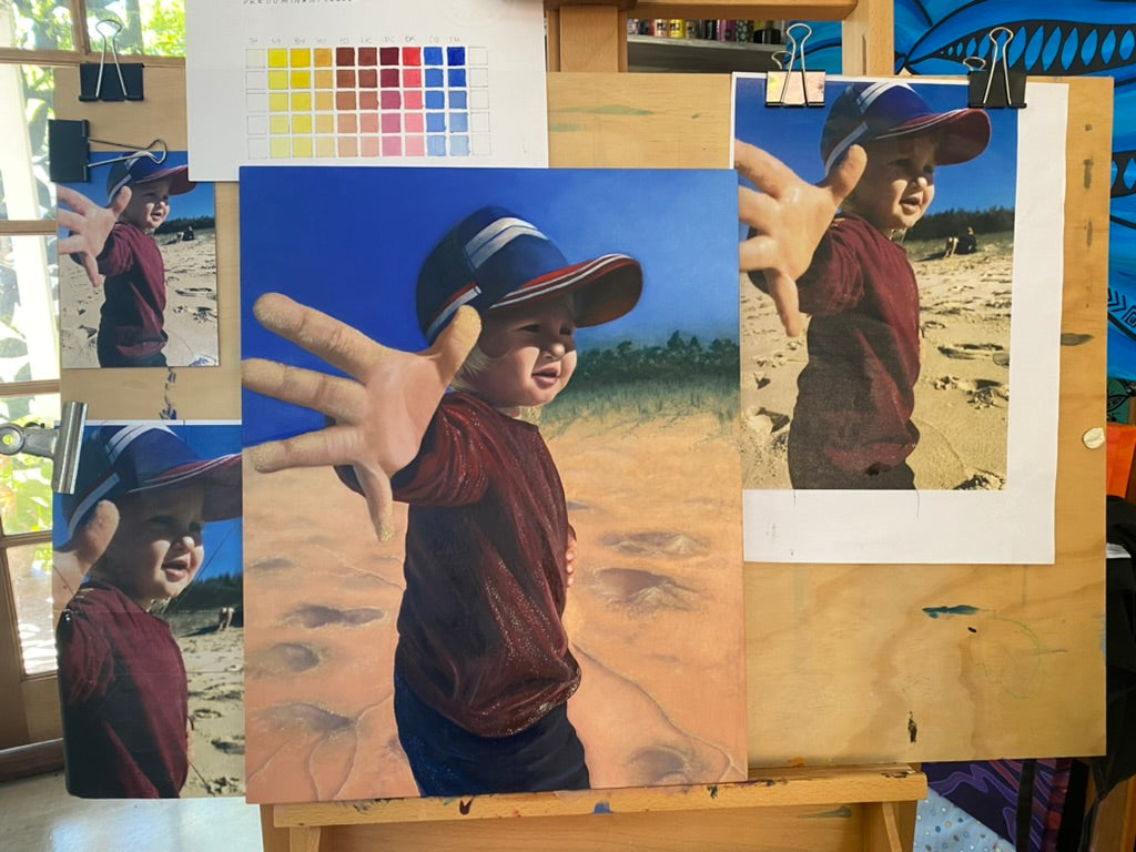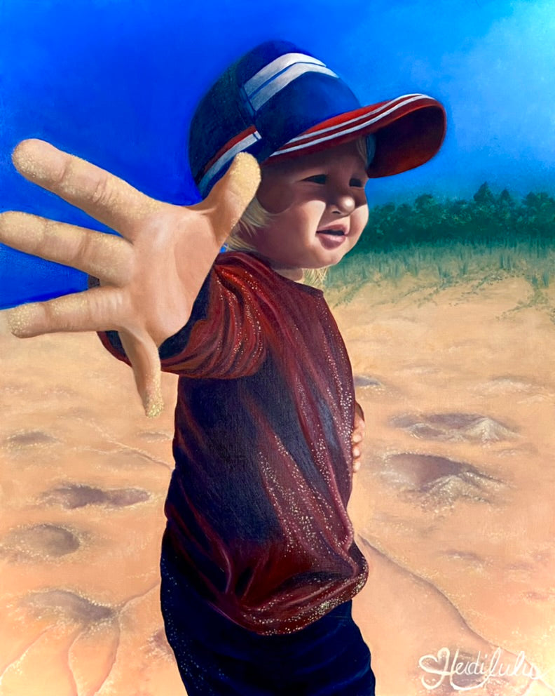 Oil painting of my gorgeous son playing at the beach. Captured with all the beach vibes and happy feels!